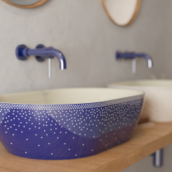 Dwie polskie manufaktury, jedna wizja, czyli ikoniczny bolesławiecki stempel przeniesiony na ekskluzywne, kompozytowe umywalki i wanny od RAVON. To spotkanie tradycyjnego rzemiosła z nowoczesnym designem – klasyczne kobaltowe zdobienia zyskały nowe życie na współczesnych formach użytkowych. Każdy egzemplarz to unikat, łączący funkcjonalność z artystycznym wyrazem.