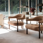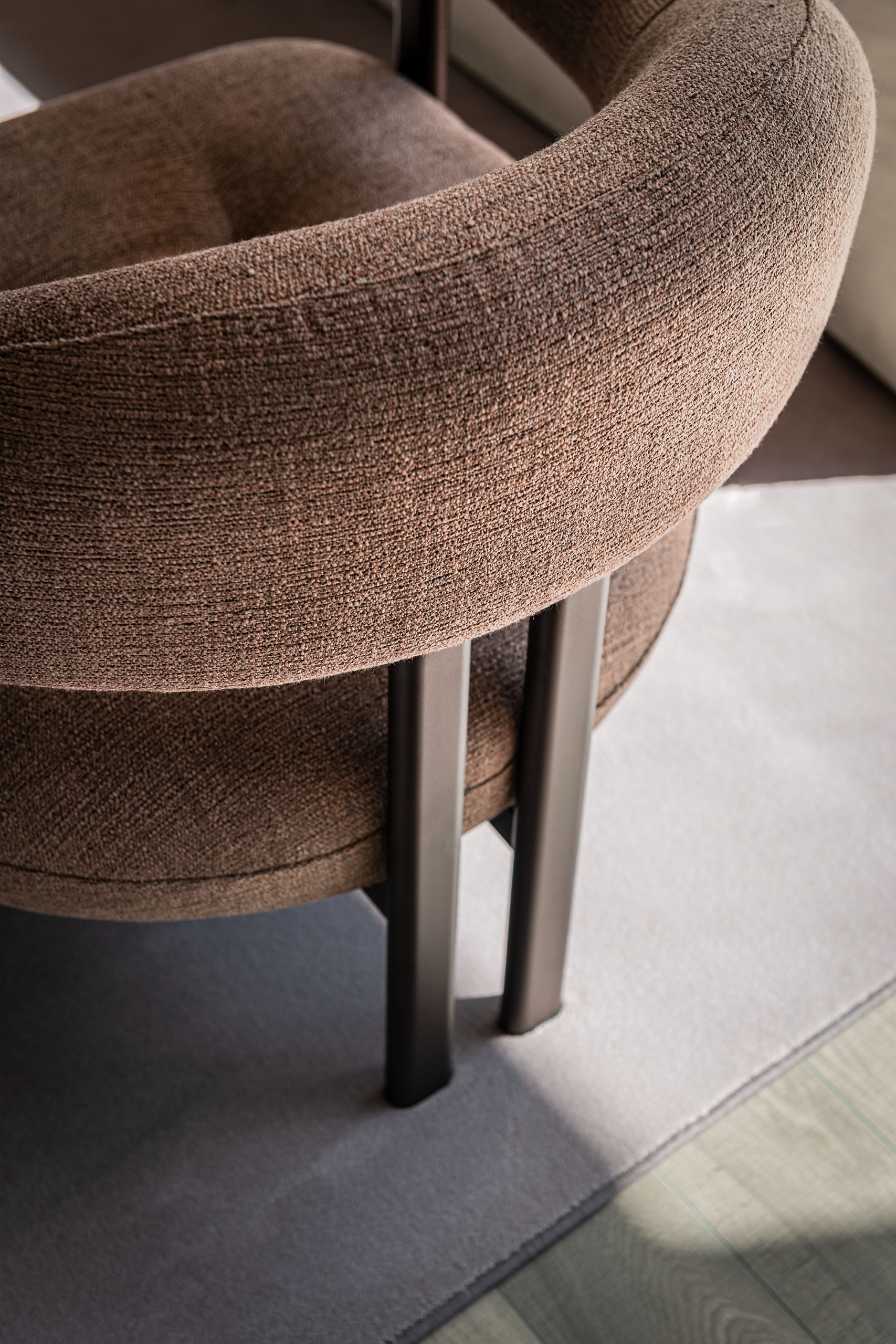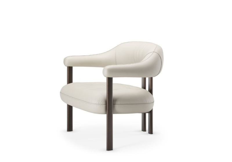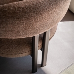 Fotel Greta Lounge marki Cattelan Italia wyróżnia się unikalną konstrukcją, w której miękkie siedzisko zostało wizualnie oddzielone od otulającego oparcia w formie wyprofilowanego cylindra. Projekt opiera się na intrygującej grze kontrastów, łącząc przytulne zaokrąglenia tapicerki z surowością metalowej podstawy oraz zestawieniem brył pełnych i pustych. Charakterystycznym detalem jest para tylnych nóg umieszczonych blisko siebie, co nadaje całości wyjątkowej lekkości i sprawia wrażenie oparcia mebla na jednym, centralnym punkcie.
