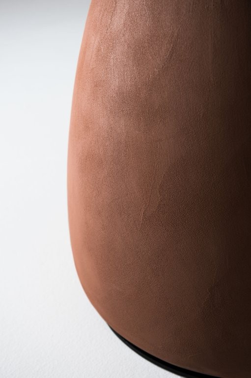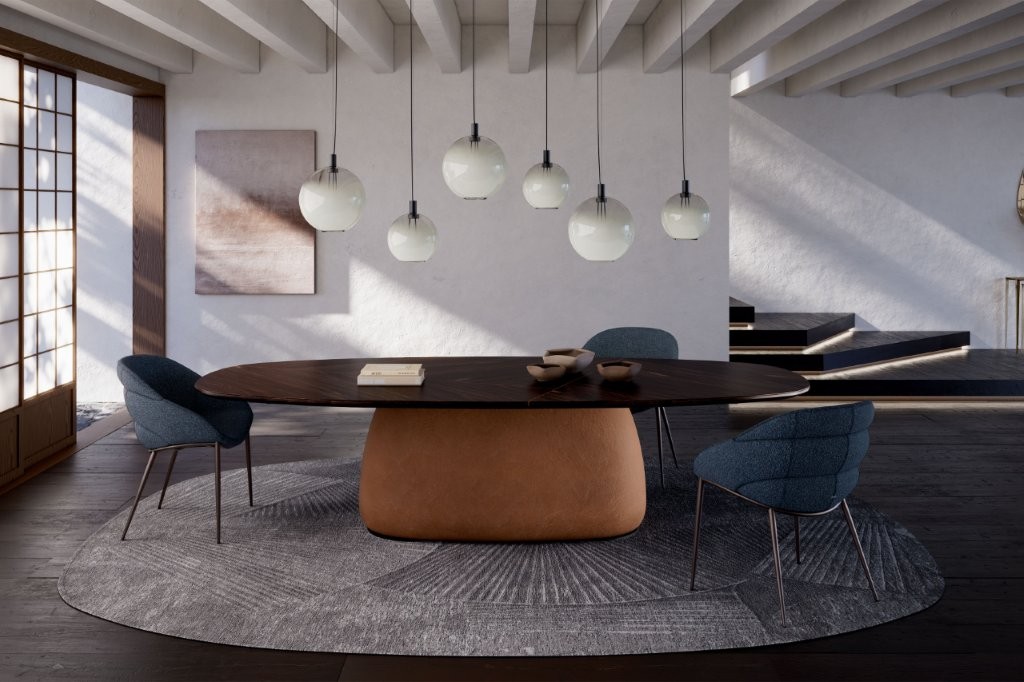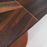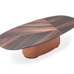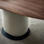 materiał: Stół z podstawą z gliny polimerowej szpachlowanej w kolorach Kair (AR05), Oslo (AR09) lub Marrakesz (AR11). Płyta podstawy z tłoczonej lakierowanej stali tytanowej (GFM11), brązowej (GFM18) lub czarnej (GFM73). Wersja „U”: blat z zaokrąglonymi krawędziami w orzechu Canaletto (NC) lub palonym dębie (RB). Wersja „Y”: ze ściętymi krawędziami w orzechu Canaletto (NC) ze szczegółami w palonym dębie lub palonym dębie (RB) ze szczegółami w orzechu Canaletto. Wersja „B”: blat w kształcie beczki ze skośnymi krawędziami w orzechu Canaletto (NC) lub palonym dębie (