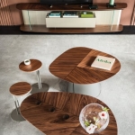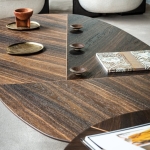 Stolik kawowy Adrian Wood, zaprojektowany przez Paolo Cattelana, to wyrafinowane połączenie stalowej, lakierowanej podstawy z drewnianym blatem o elegancko fazowanych krawędziach. Unikalny charakter mebla podkreślają dwukolorowe kompozycje wykończeń, łączące szlachetny orzech Canaletto z wypalonym dębem w dwóch efektownych wariantach. Dzięki dostępności trzech wysokości oraz różnych rozmiarów blatu, stolik oferuje szerokie możliwości konfiguracji, pozwalając na tworzenie dynamicznych zestawień w nowoczesnym salonie.