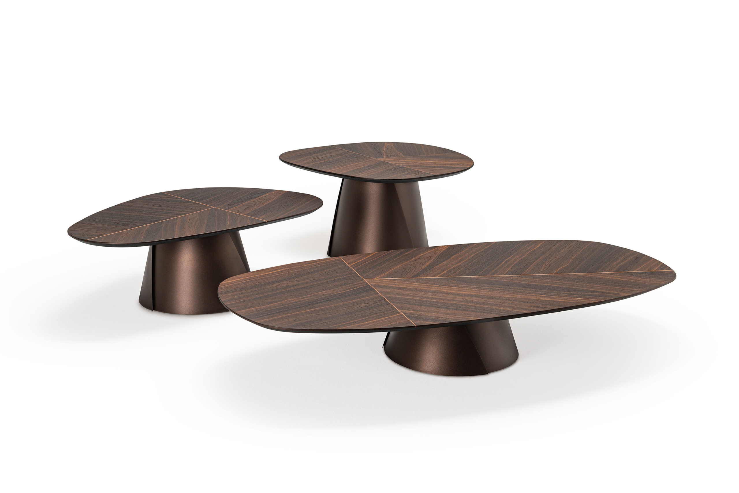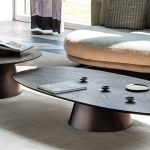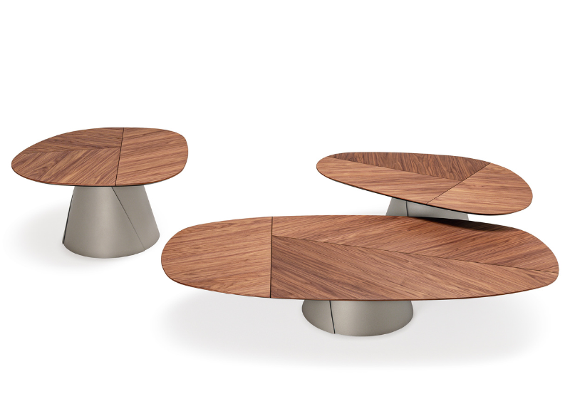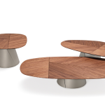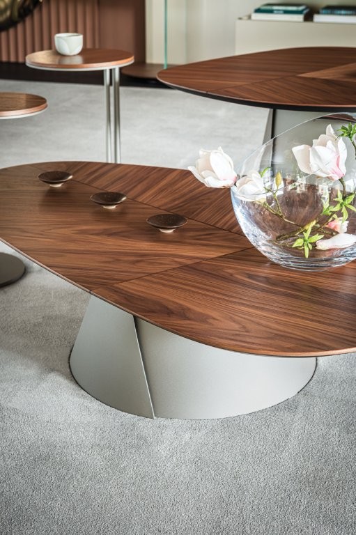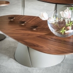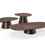 materiał: Podstawa z tytanu (GFM11) lub brązu (GFM18) z tłoczoną lakierowaną stalą. Blat z wywiniętymi krawędziami z orzecha Canaletto (NC) z detalami z palonego dębu lub palonego dębu (RB) z detalami z orzecha Canaletto.