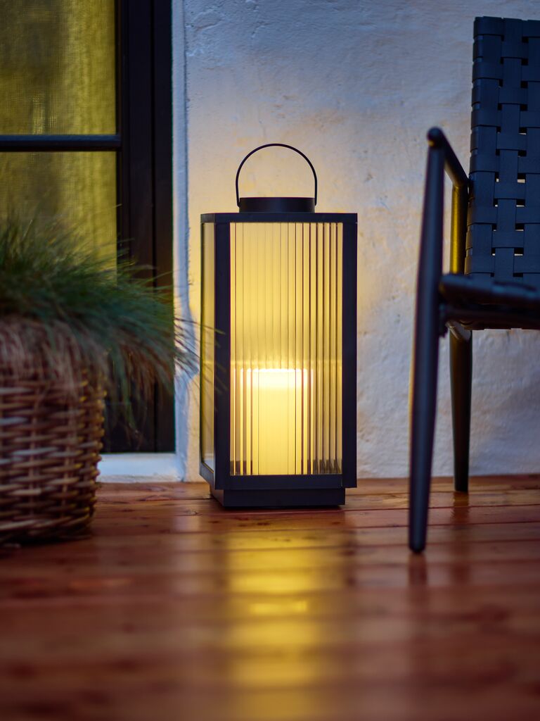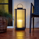Czarna latarnia w klasycznym stylu wykonana z plastiku i szkła. Zawiera 3 świece LED i funkcję wyłącznika czasowego z interwałami 16/8 godzin. Idealna do tworzenia przytulnego oświetlenia na zewnątrz. Wymaga 3 baterii AA (brak w zestawie). S22 x D22 x W48 cm