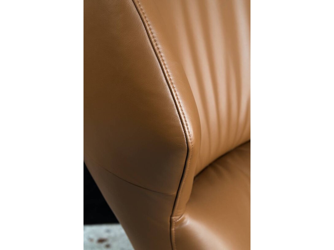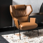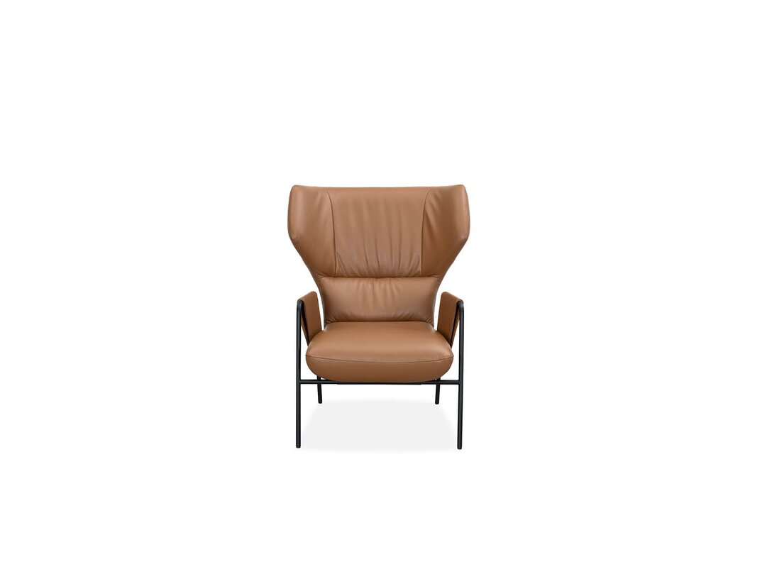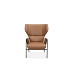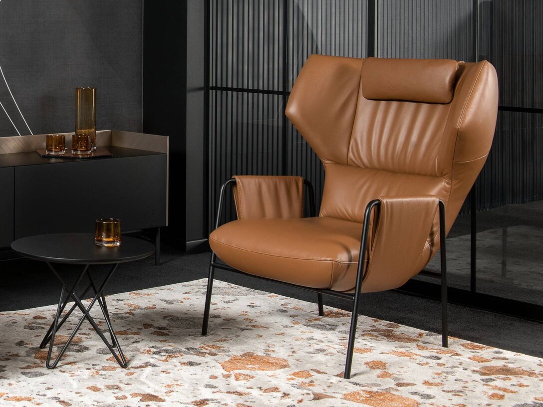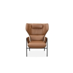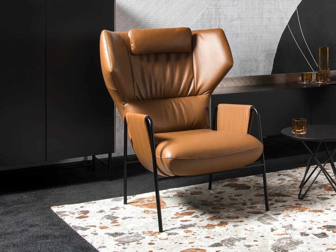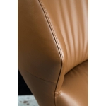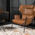 Obicie fotela KLER Staccato to do wyboru: naturalna skóra w kolorze brązowym lub połączenie brązowej skóry z beżową tkaniną z kolekcji Amaral. Całość stoi na delikatnych, smukłych, metalowych nogach pomalowanych proszkowo na kolor czarny. Możliwa jest również zmiana konfiguracji fotela w zestaw fotela z pufem w tym samym obiciu.