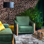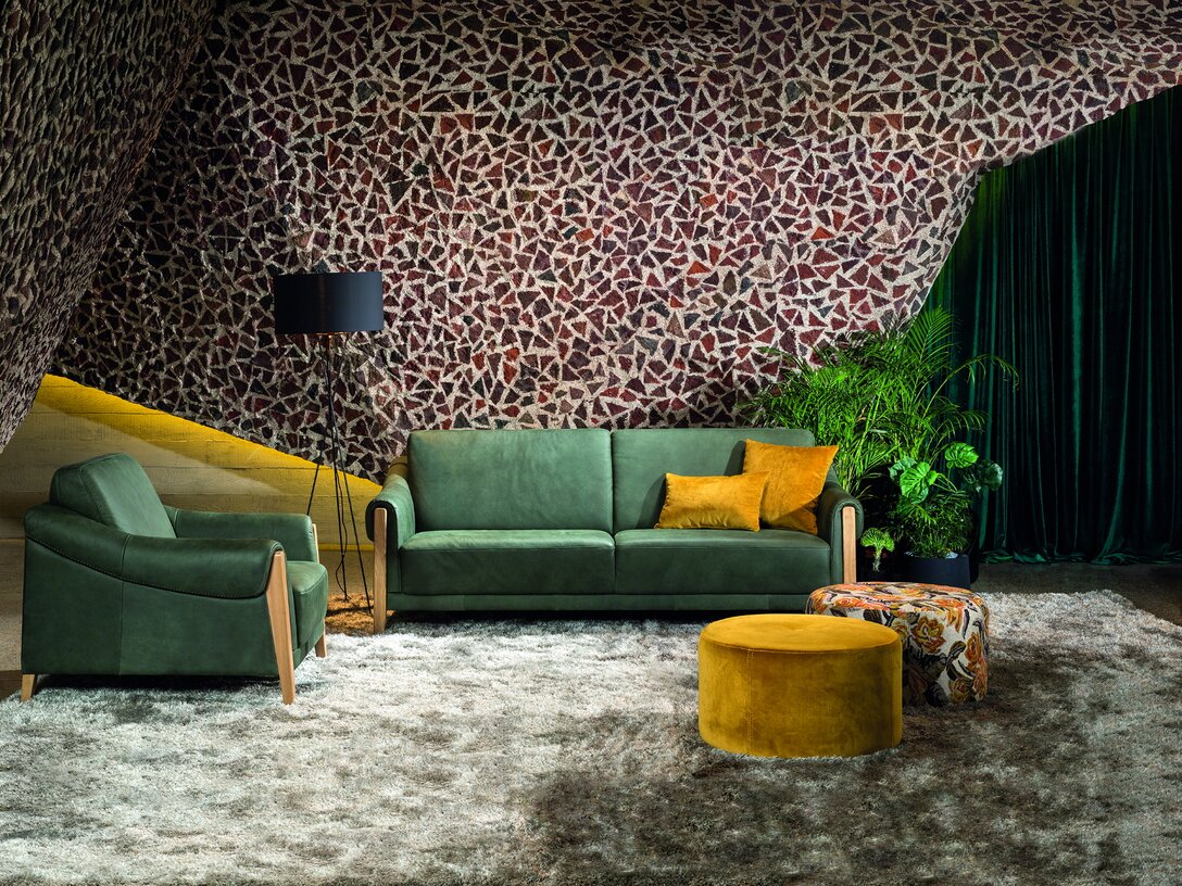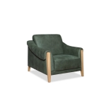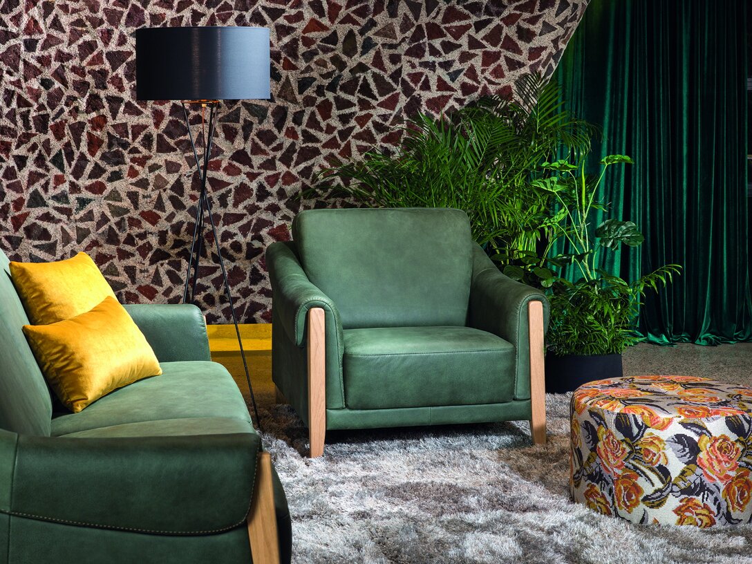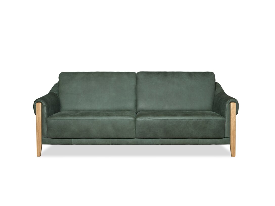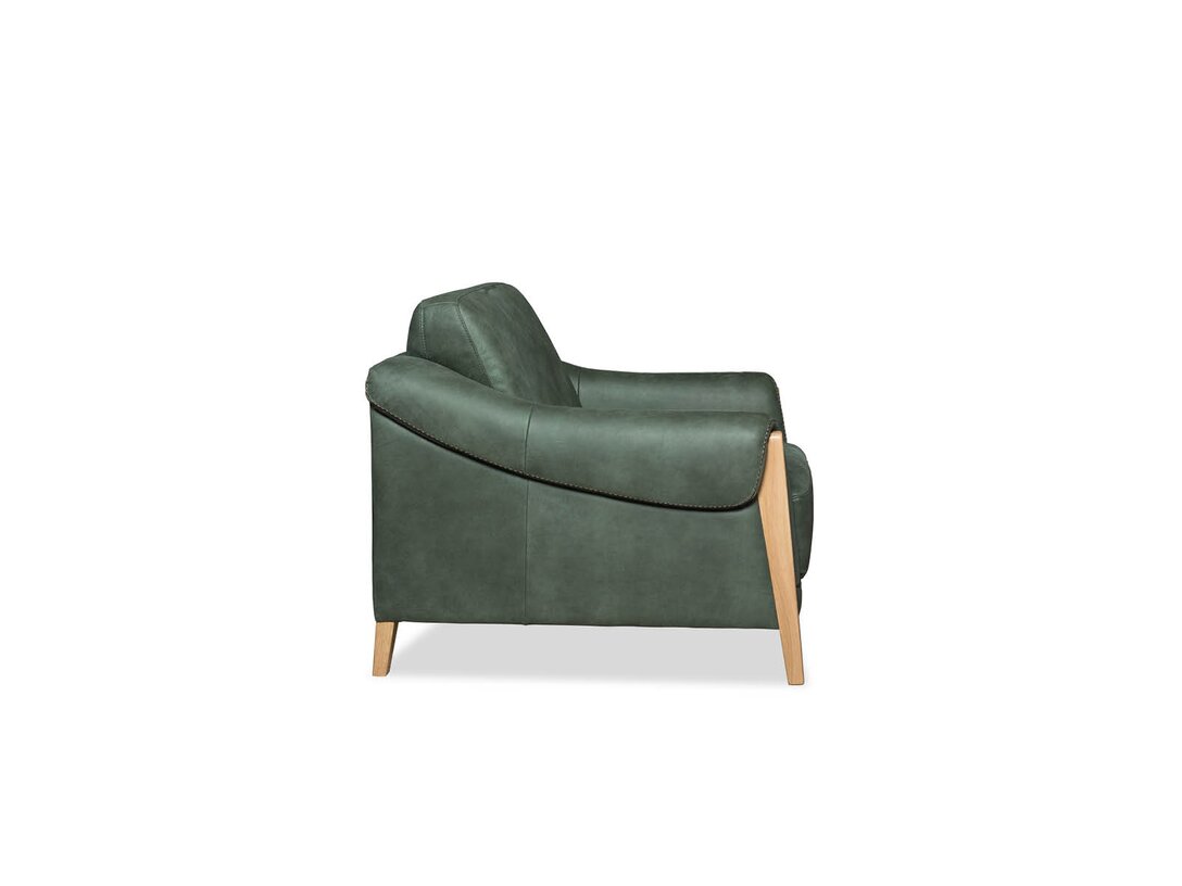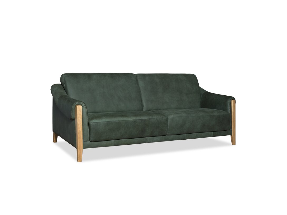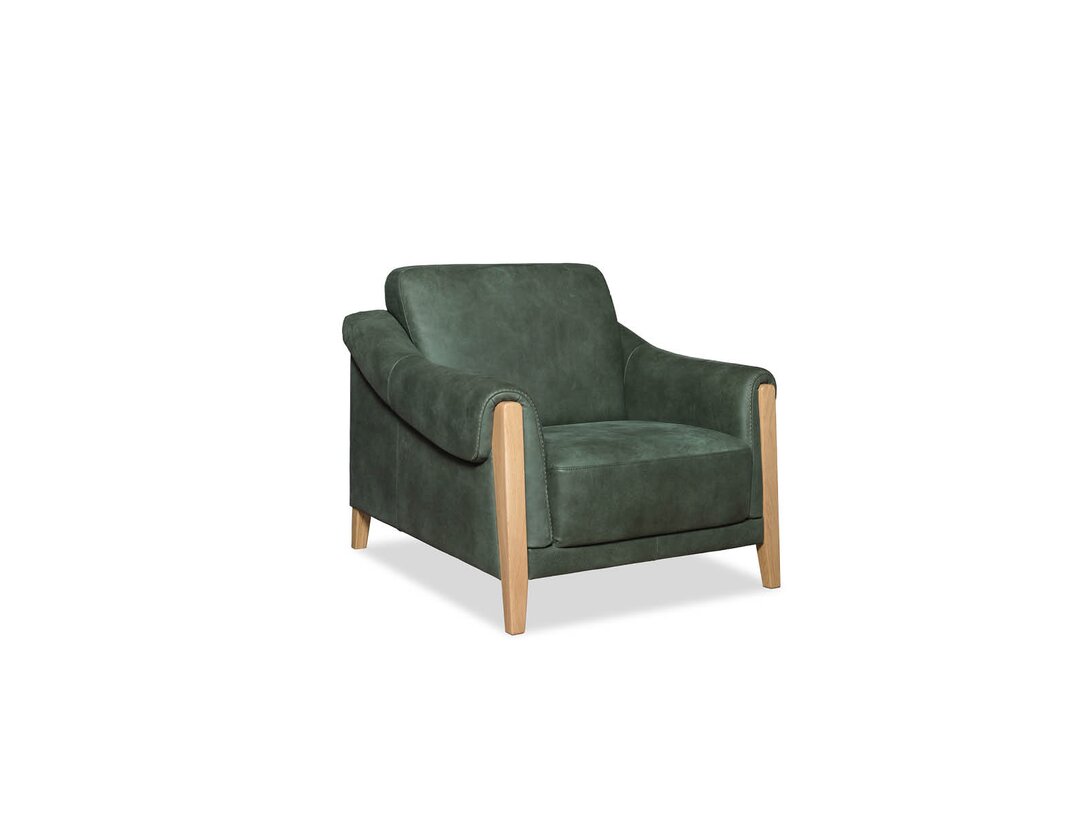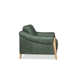 Komplet jest dostępny w obiciu skórzanym w kolorze zielonym, zaś nogi wykonano z dębu w kolorze naturalnym. Ciekawym detalem jest ozdobny szew (fastryga) znajdujący się w przedniej części podłokietnika. Pożądany komfort, charakterystyczny dla tego rodzaju mebli, osiągnięto dzięki zastosowaniu w siedziskach, oparciu i podłokietnikach odpowiednich pianek, włóknin puszystych oraz sprężyn.