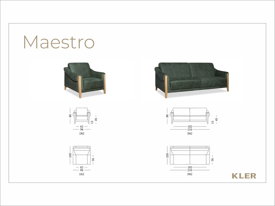 KLER Maestro jest meblem salonowym, ale doskonale sprawdza się w gabinecie lub bibliotece. Oferowany komplet składa się z kanapy trzyosobowej oraz dwóch foteli.