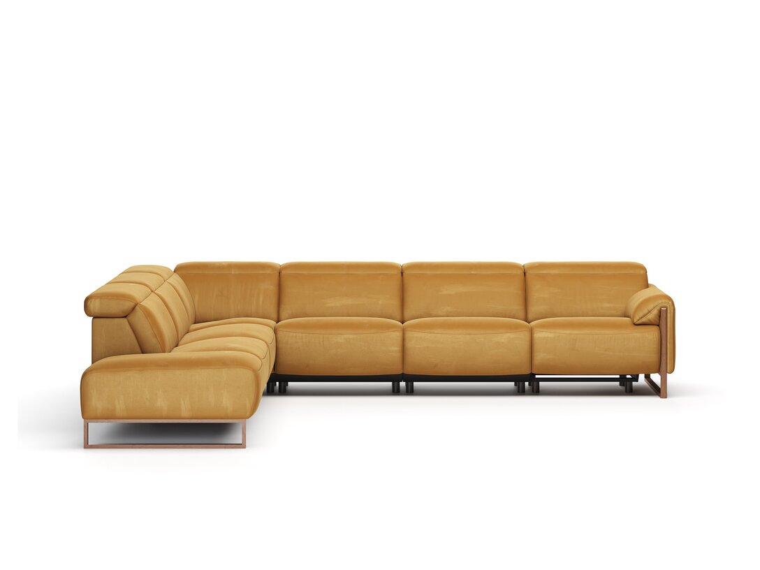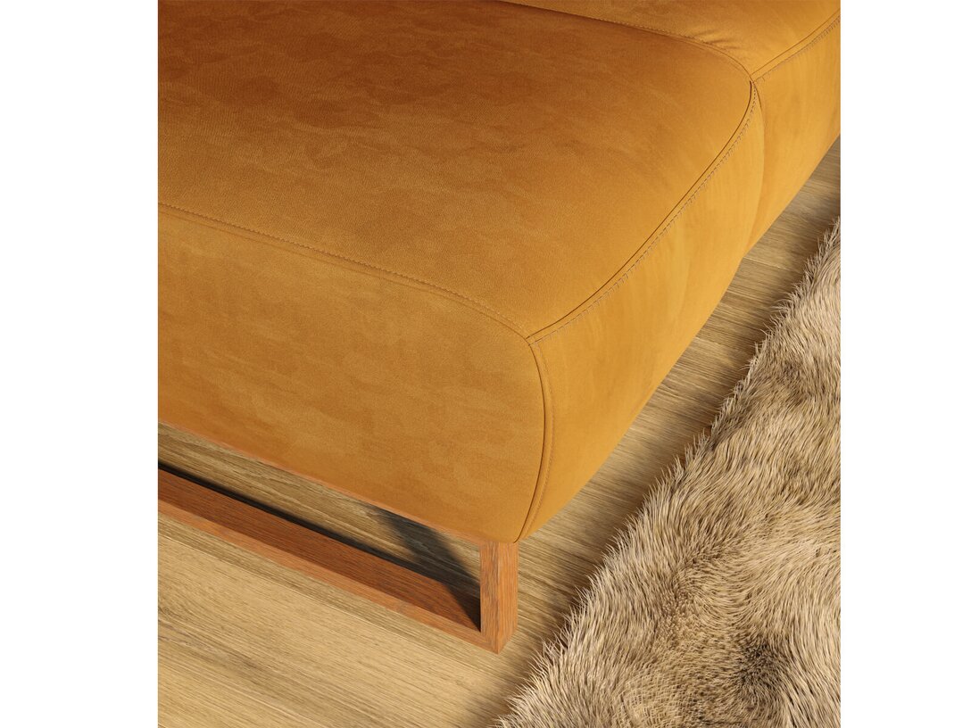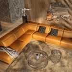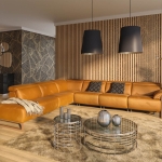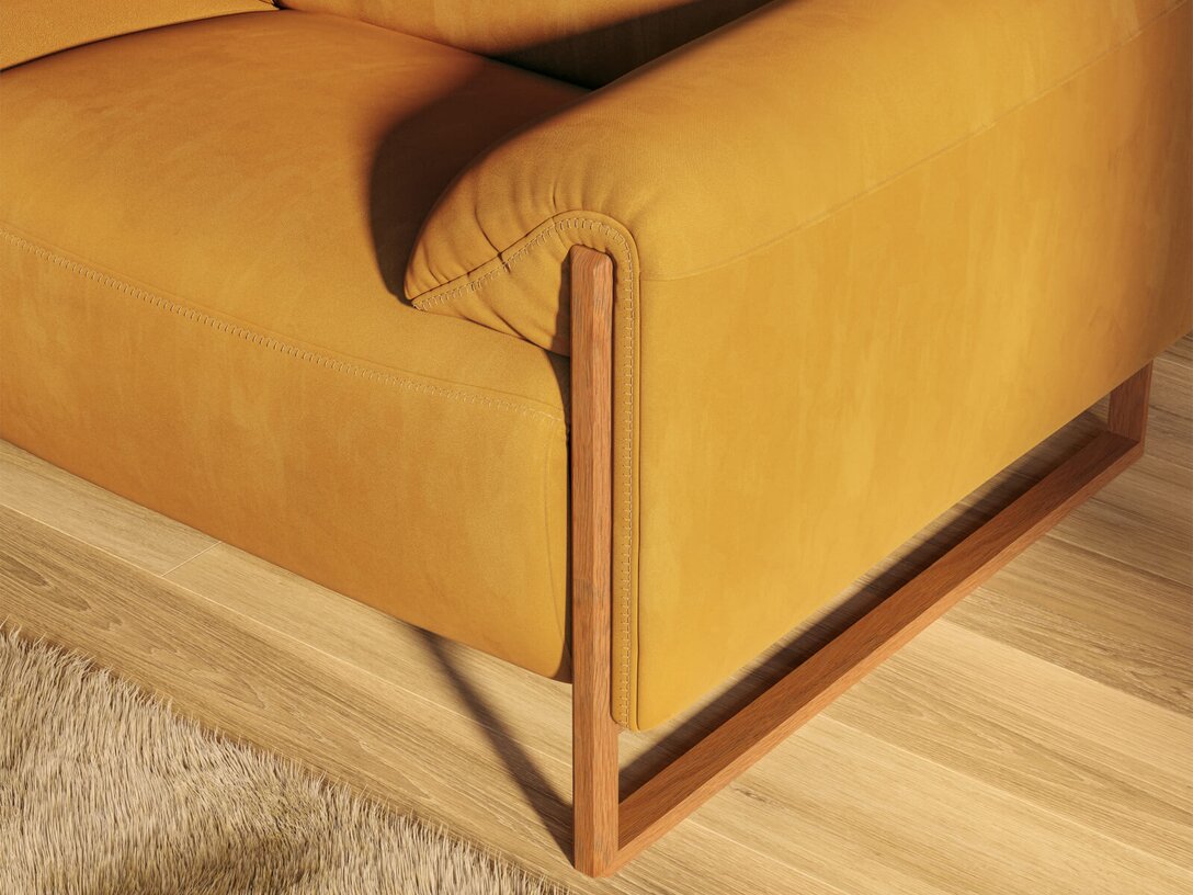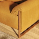 Narożnik wypoczynkowy KLER Opera składa się ze zróżnicowanych brył, co pozwala dostosować go do indywidualnych potrzeb. Narożnik z jednej strony zakończony jest podłokietnikiem, a drugi bok wieńczy element otwarty, stanowiący dodatkowe miejsce siedzące. Jest dostępny w układzie prawo- lub lewostronnym. Całość wykonano w tkaninie z kolekcji Daytona w kolorze karmelowym lub w naturalnej skórze w kolorze brązowym. Narożnik posiada widoczne nogi w kształcie płóz wykonane z orzecha amerykańskiego w kolorze naturalnym.