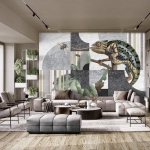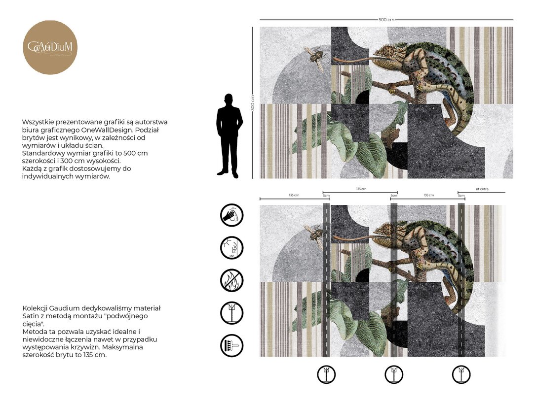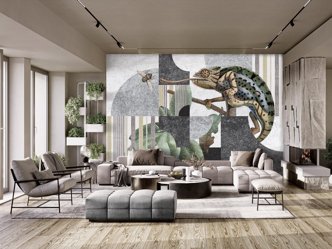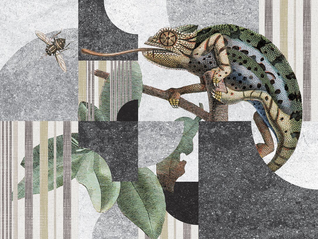 Tapeta Acciarella to wyjątkowy element dekoracyjny, który podkreśli ekskluzywny charakter wnętrza. Jej unikalny design łączy geometrię, sztukę i elementy przyrody, tworząc efektowną kompozycję o wyrazistym charakterze. Artystycznie stylizowana scena z kameleonem łapiącym muchę długim językiem, otoczona dekoracyjnymi liśćmi i abstrakcyjnymi kształtami, ma dekoracyjny i graficzny charakter. Nowoczesne wzornictwo oraz doskonała jakość materiałów sprawiają, że tapeta doskonale komponuje się zarówno w eleganckich, współczesnych aranżacjach, jak i przestrzeniach inspirowanych naturą. Przeznaczona dla osób ceniących nietuzinkowy styl i luksus, wnosi do wnętrza niepowtarzalną estetykę i podkreśla jego indywidualny charakter.