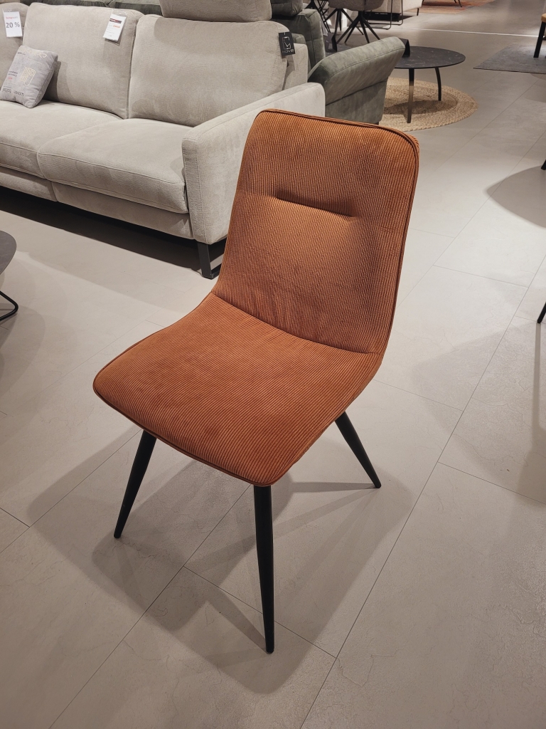 Zgrabne krzesło wykonane w sztruksowej tkaninie w kolorze rudym.
