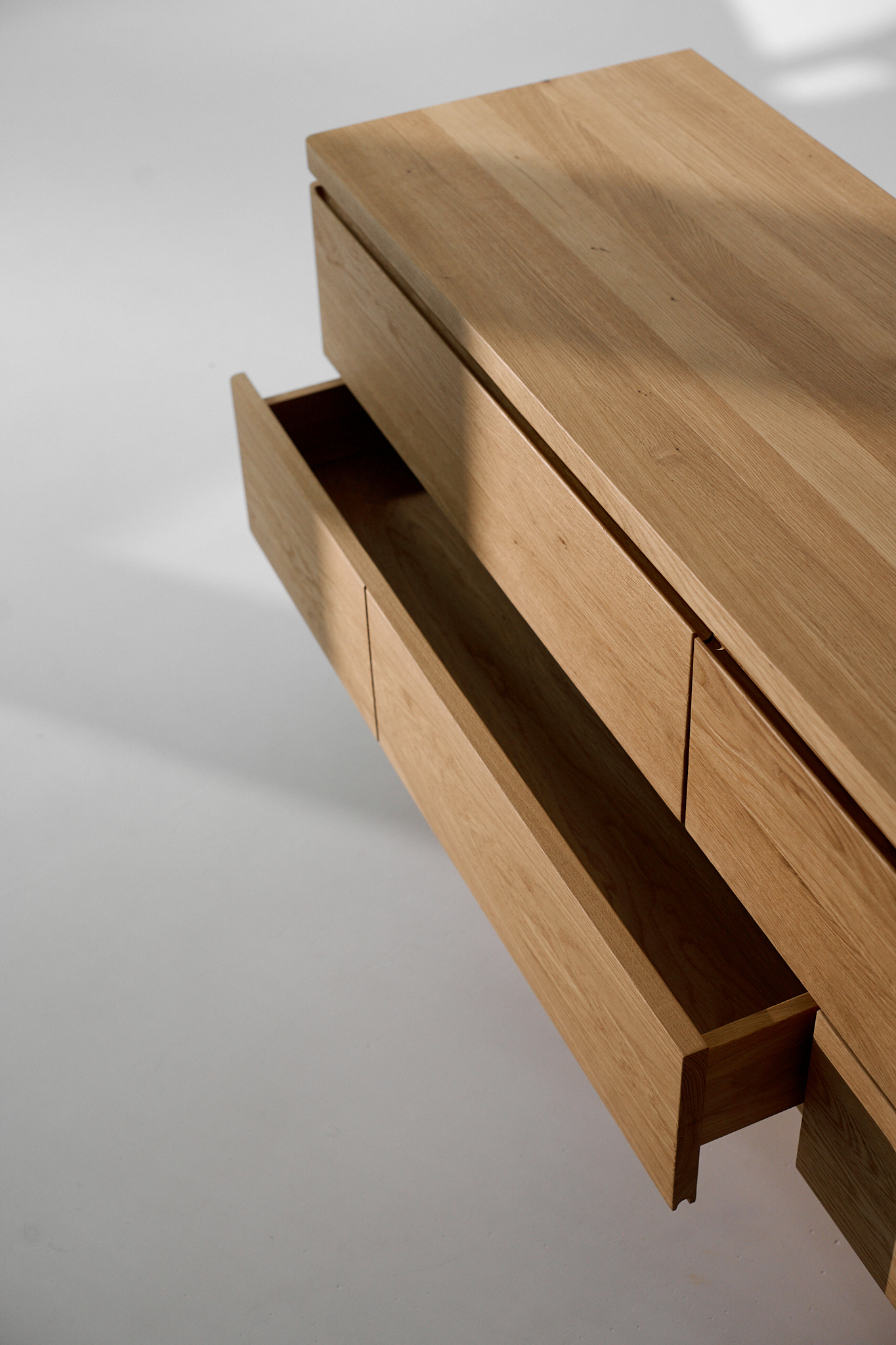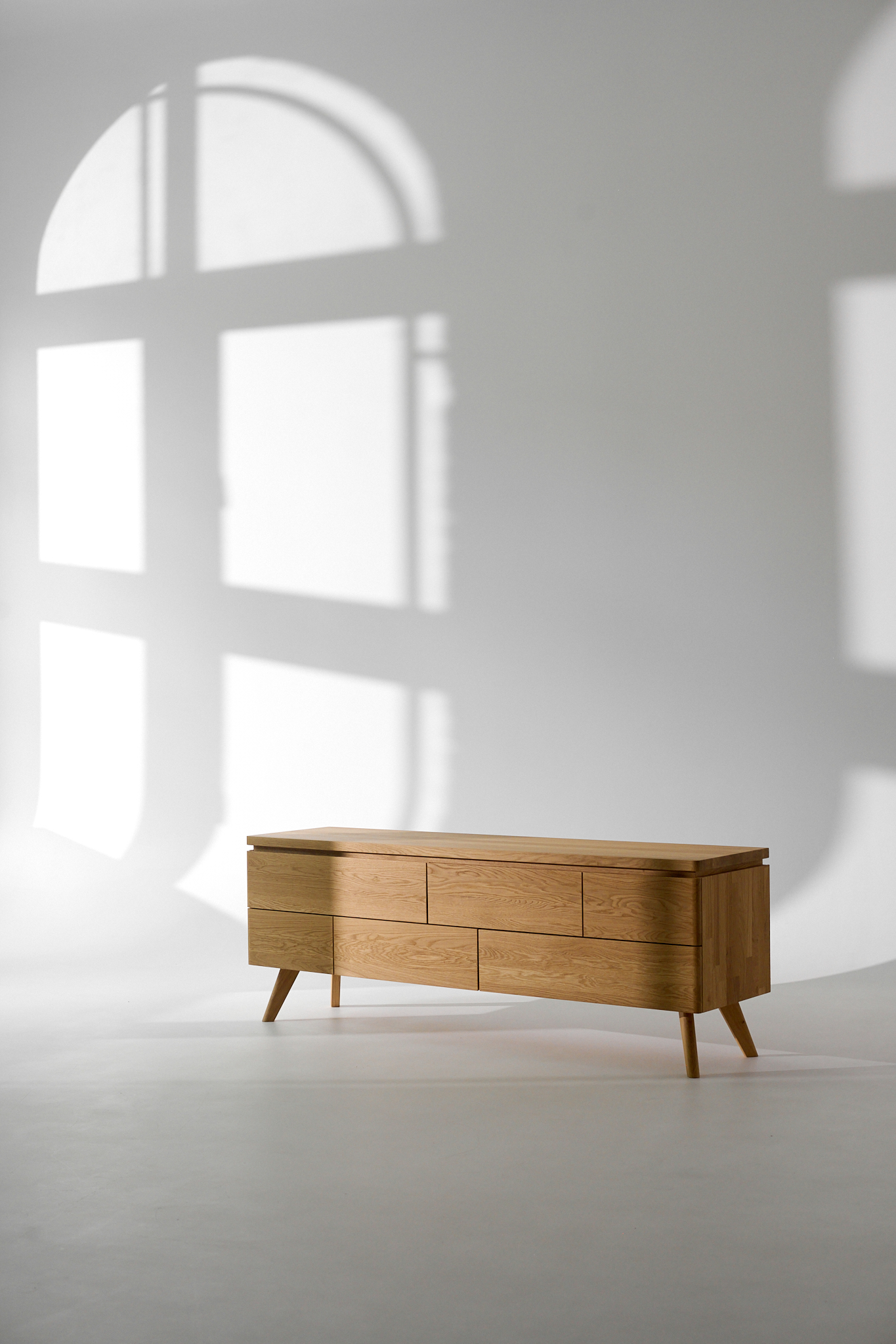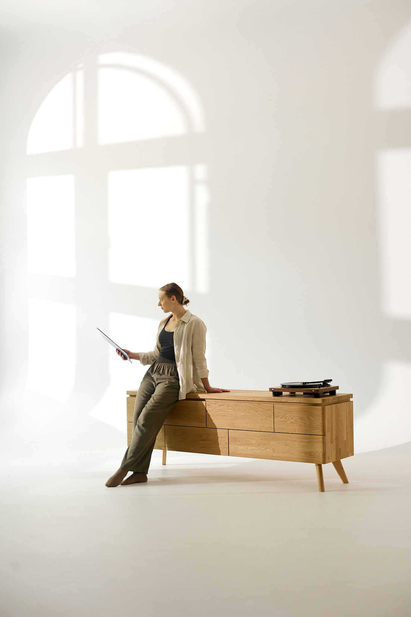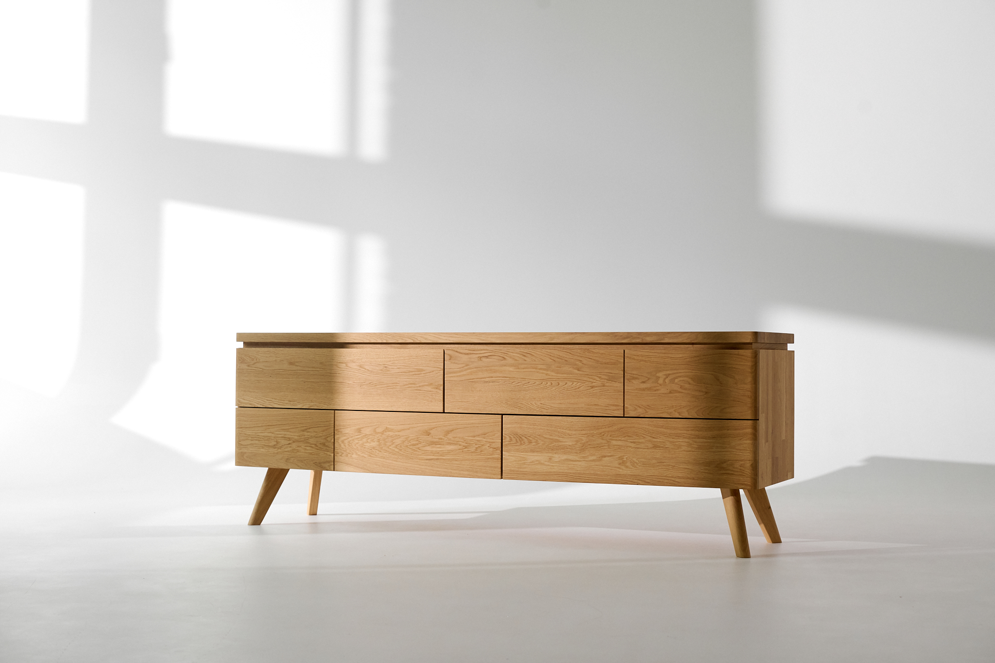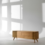 Szafka pod TV Modesta to elegancka, dębowa szafka RTV na nóżakch. Oferuje mnóstwo miejsca do przechowywania dzięki czterem pojemnym szufladom z cichym domykiem. Starannie wykonane frezy i subtelny efekt szczotkowania nadają tej prostej formie nienaganną estetykę. Dzięki temu szafka sprawdzi się zarówno w klasycznych, jak i nowoczesnych wnętrzach.