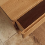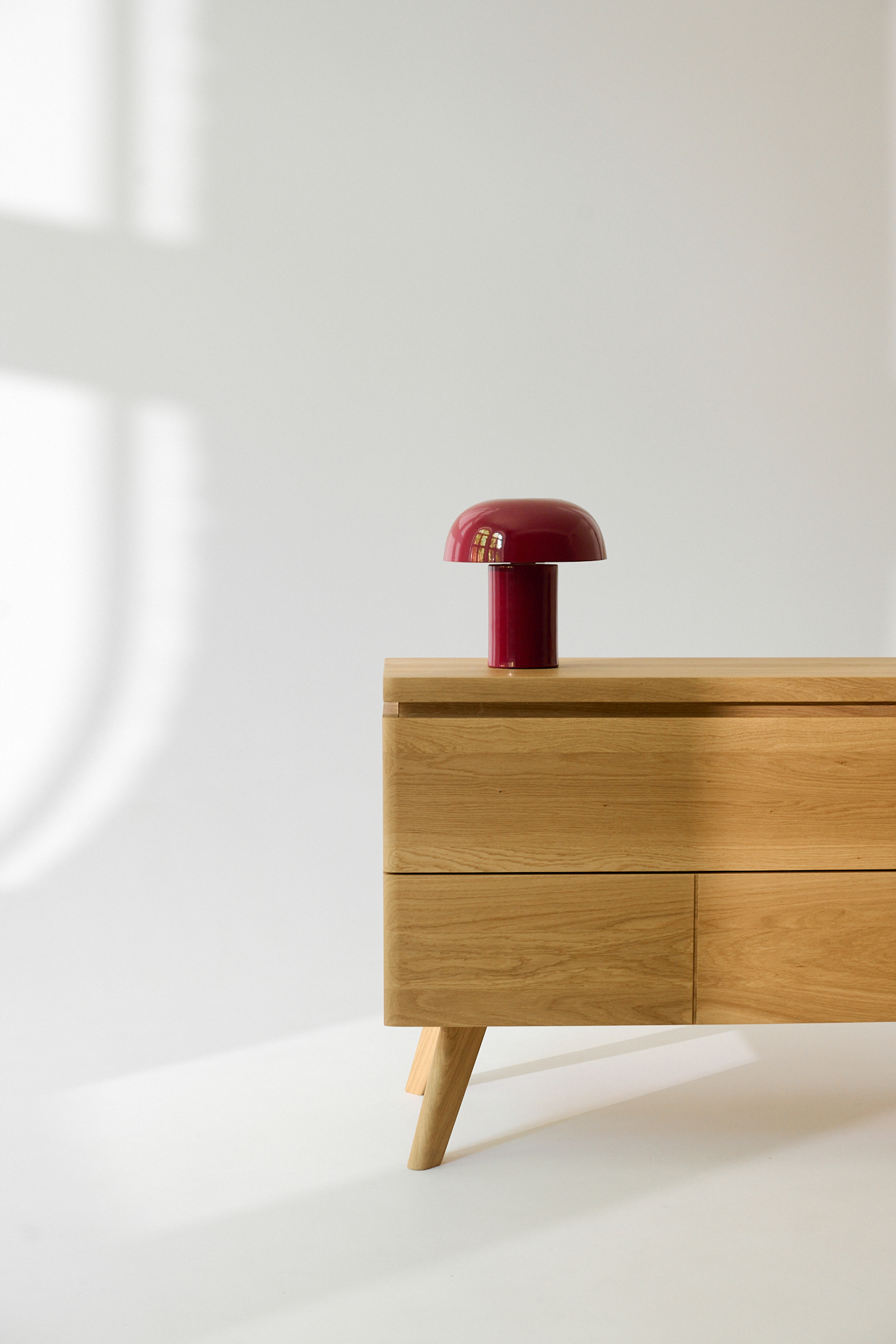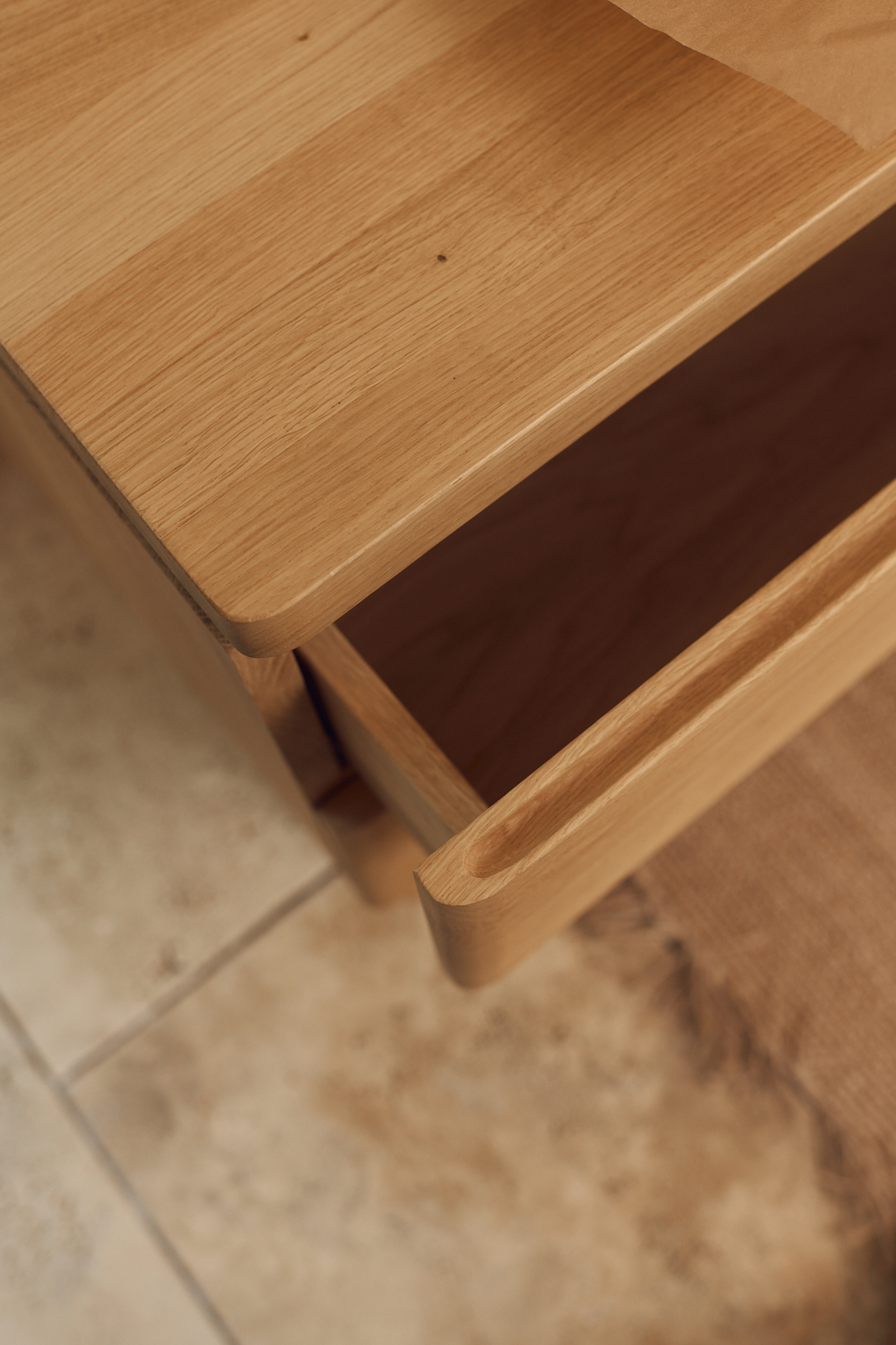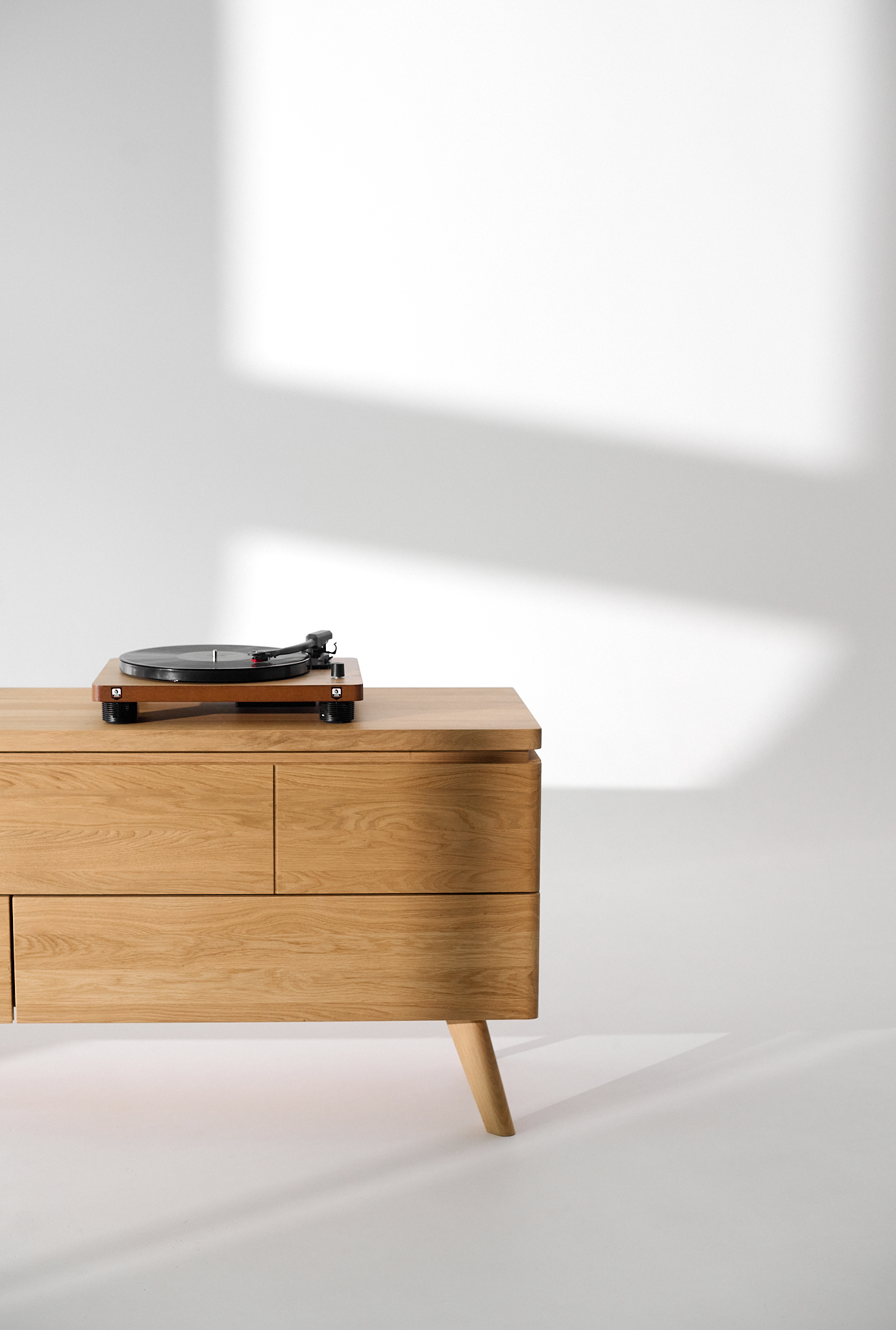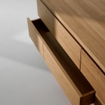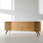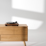 Szafka pod TV Modesta to elegancka, dębowa szafka RTV na nóżakch. Oferuje mnóstwo miejsca do przechowywania dzięki czterem pojemnym szufladom z cichym domykiem. Starannie wykonane frezy i subtelny efekt szczotkowania nadają tej prostej formie nienaganną estetykę. Dzięki temu szafka sprawdzi się zarówno w klasycznych, jak i nowoczesnych wnętrzach.
