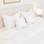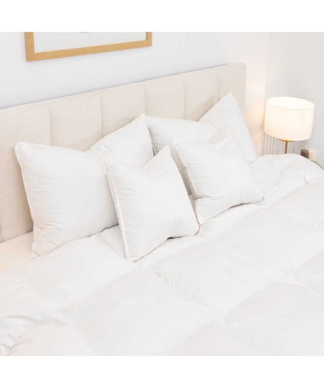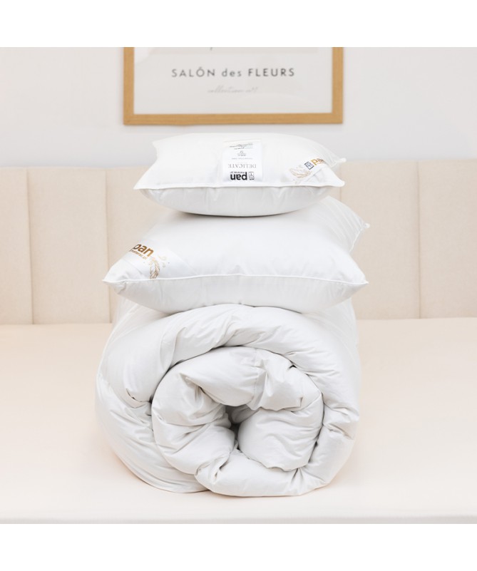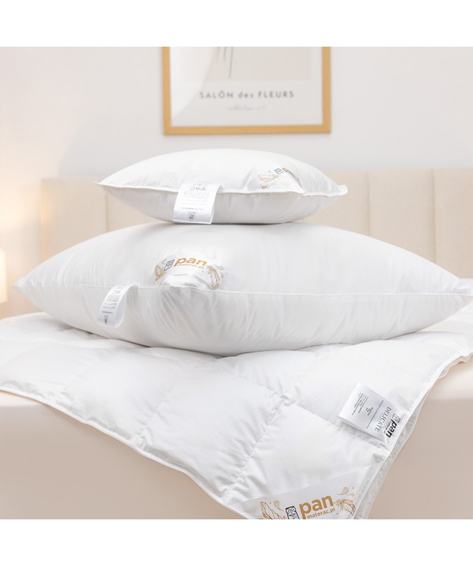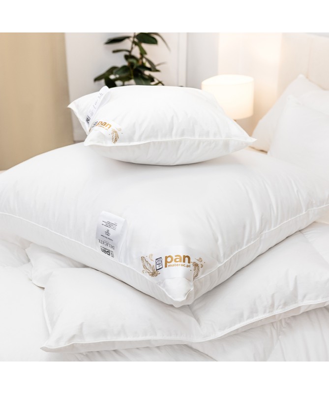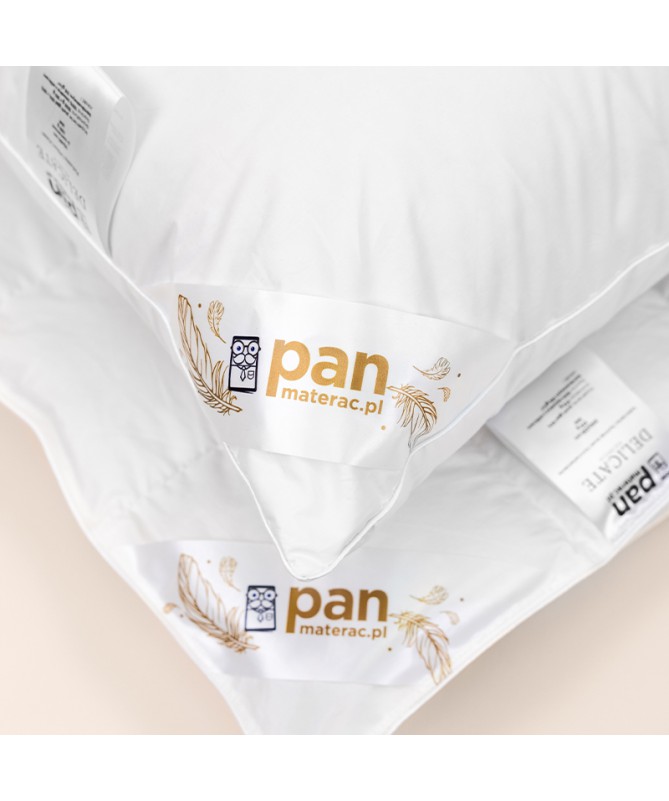 Poduszka Delicate Pan Materac to luksusowy produkt, który łączy w sobie najwyższą jakość wykonania i komfort użytkowania. Dostępna jest w dwóch wariantach: jednokomorowa poduszka o wymiarach 40×40 oraz trzykomorowe poduszki w rozmiarach 50×70 i 70×80. Każdy model został wypełniony najwyższej jakości polskim puchem gęsim, który od lat cieszy się uznaniem ze względu na swoją wyjątkową lekkość i zdolność do zapewnienia izolacji termicznej. W przypadku poduszki 40×40 cm wypełnienie stanowi w 90% polski puch gęsi, a pozostałe 10% to miękkie piórka, które zostały poddane zaawansowanemu procesowi EEC. W większych rozmiarach poduszki Delicate Pan Materac zastosowano konstrukcję trzykomorową. Komory zewnętrzne wypełnione są w 90% polskim puchem gęsim