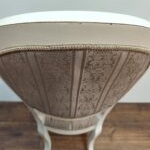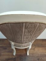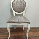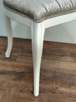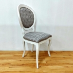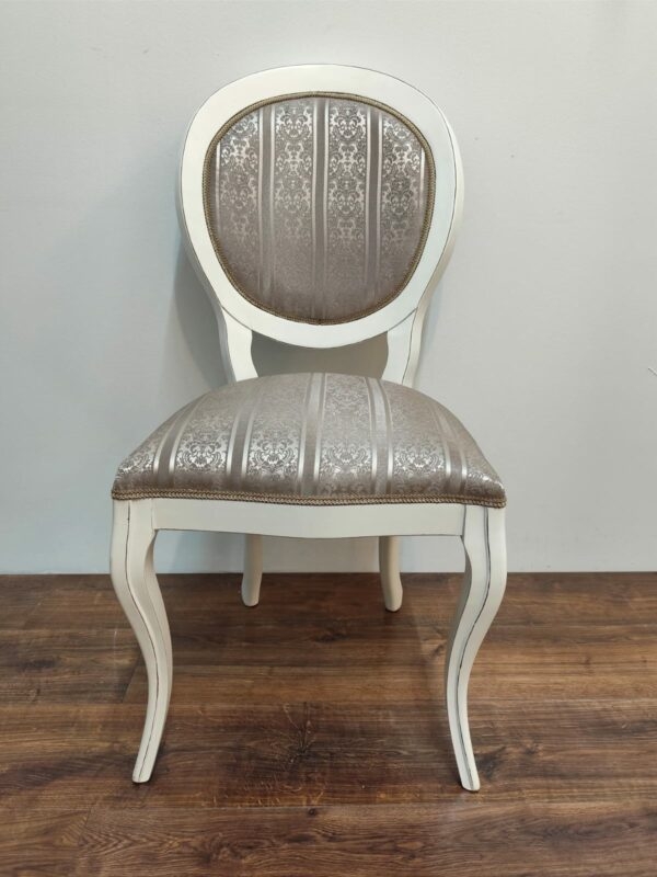 Krzesło Orchidea to elegancki mebel produkcji włoskiej. Zaprojektowane tak, aby pasowało zarówno do wnętrz klasycznych, jak i nowoczesnych lub w stylu glamour. Drewno bukowe wybarwiono na kolor biały, przecierany na krawędziach. Tkanina obiciowa to eleganckie pasy w beżowych odcieniach. Wykończenie: torsatka w kolorze tkaniny.