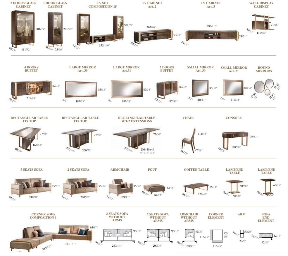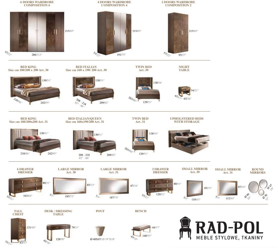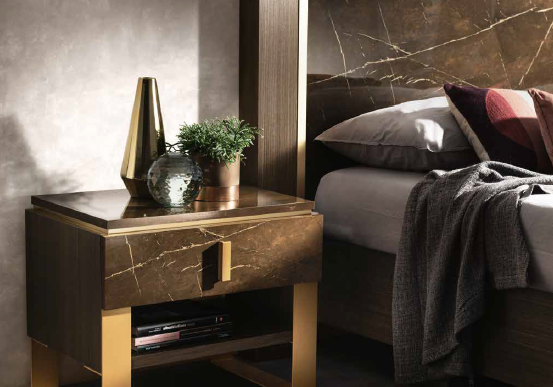 Kolekcja mebli Arr Essenza do sypialni to połączenie współczesnej nowoczesności z elegancją na najwyższym poziomie. Cechą charakterystyczną tej włoskiej kolekcji jest styl modern classic. Meble doskonale będą się prezentować we wnętrzach urządzonych w aranżacji nowoczesnej oraz glamour. Sypialnia Arr Essenza wyróżnia się niecodziennym połączeniem materiałów, które dodają jej elegancji. Ciemne drewno stylizowane na marmur, złote detale połączone z miękką tapicerką i prostymi formami to precyzyjnie dopracowane szczegóły i najwyższa jakość wykonania. Komoda i toaletka Arr Essenza posiadają cichy domyk. Wnętrze szuflad wykończone jest przyjemnym w dotyku, eleganckim welurem. Do stworzenia włoskiej sypialni Arr Essenza użyto najwyższej jakości materiałów.