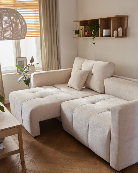 - Optymalna głębokość siedziska tworzy obszerną wyspę relaksu, która z powodzeniem zastępuje większe meble modułowe, nie przytłaczając przy tym wnętrza.