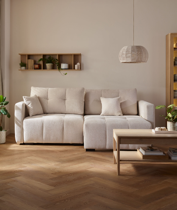 - Dwa ukryte wewnątrz bryły, obszerne pojemniki na pościel zapewniają dodatkową przestrzeń do przechowywania, ułatwiając utrzymanie idealnego porządku w strefie dziennej.