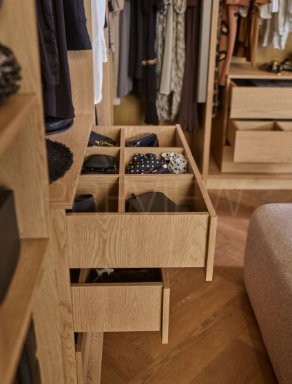 - Wersja Comfort obejmuje 3 górne półki stałe, 3 drążki na ubrania oraz 5 regulowanych półek w prawej części mebla. Centralny segment zajmuje kontenerek z 3 szufladami, doskonały do organizacji bielizny i drobiazgów.