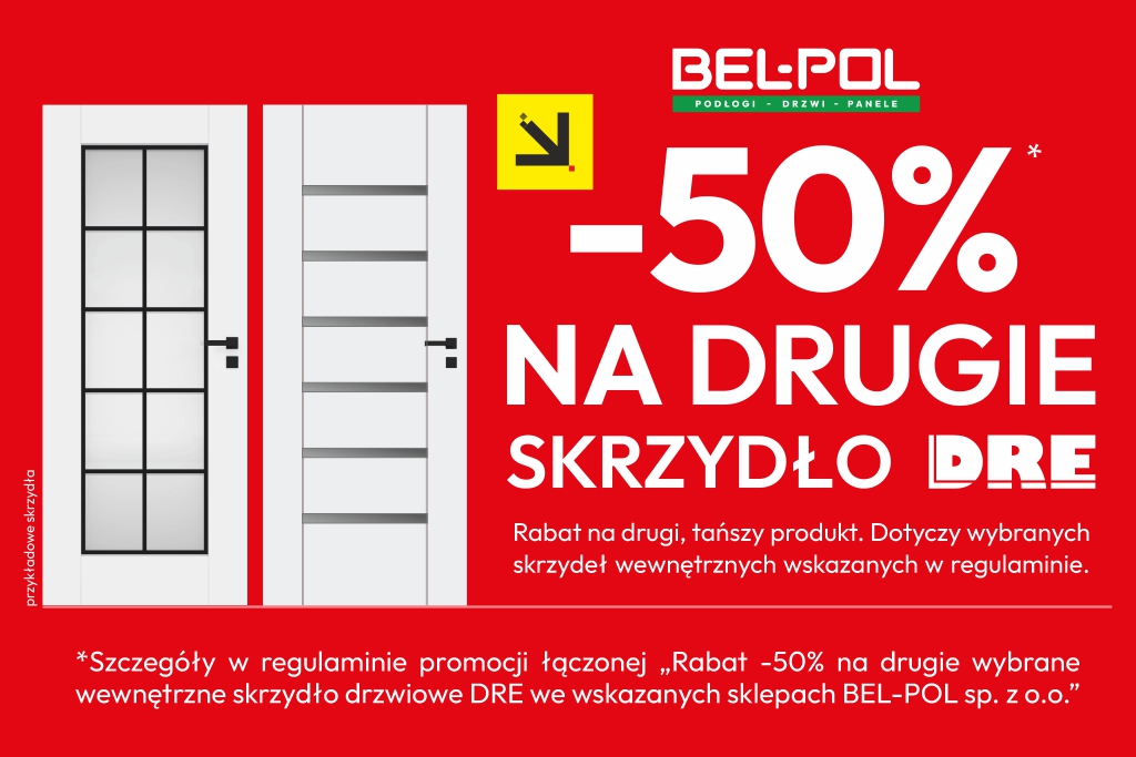 *Szczegóły w regulaminie promocji łączonej „Rabat -50% na drugie wybrane wewnętrzne skrzydło drzwiowe DRE we wskazanych sklepach BEL-POL sp. z o.o.”