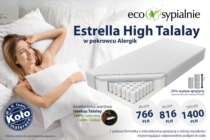 Materac Estrella High jest dostępny w specjalnej cenie promocyjnej, co czyni go jeszcze bardziej atrakcyjnym wyborem. To doskonała okazja, aby zainwestować w swój komfort i zdrowie.
