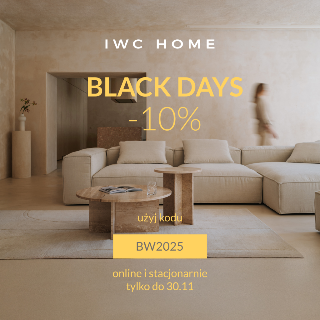Black Days w IWC HOME! Tylko do 30.11 cała oferta jest tańsza o 10%. Idealny moment, by odświeżyć wnętrze i złapać ulubione kolekcje w lepszej cenie. 🖤