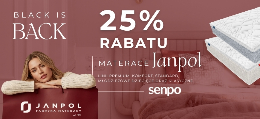 Klient detaliczny otrzymuje 25% rabatu na wszystkie materace linii Premium, Komfort, Standard, Młodzieżowe, Dziecięce i Klasyczne marki Janpol – we wszystkich dostępnych rozmiarach. Promocja obowiązuje od 14 listopada do 8 grudnia 2025 r.