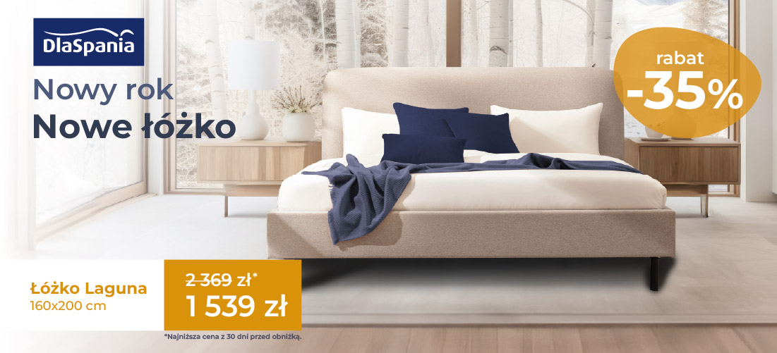 Teraz łóżko Laguna 160×200 tylko 1 539 zł (najniższa cena z 30 dni przed obniżką 2 369 zł). 🛏️